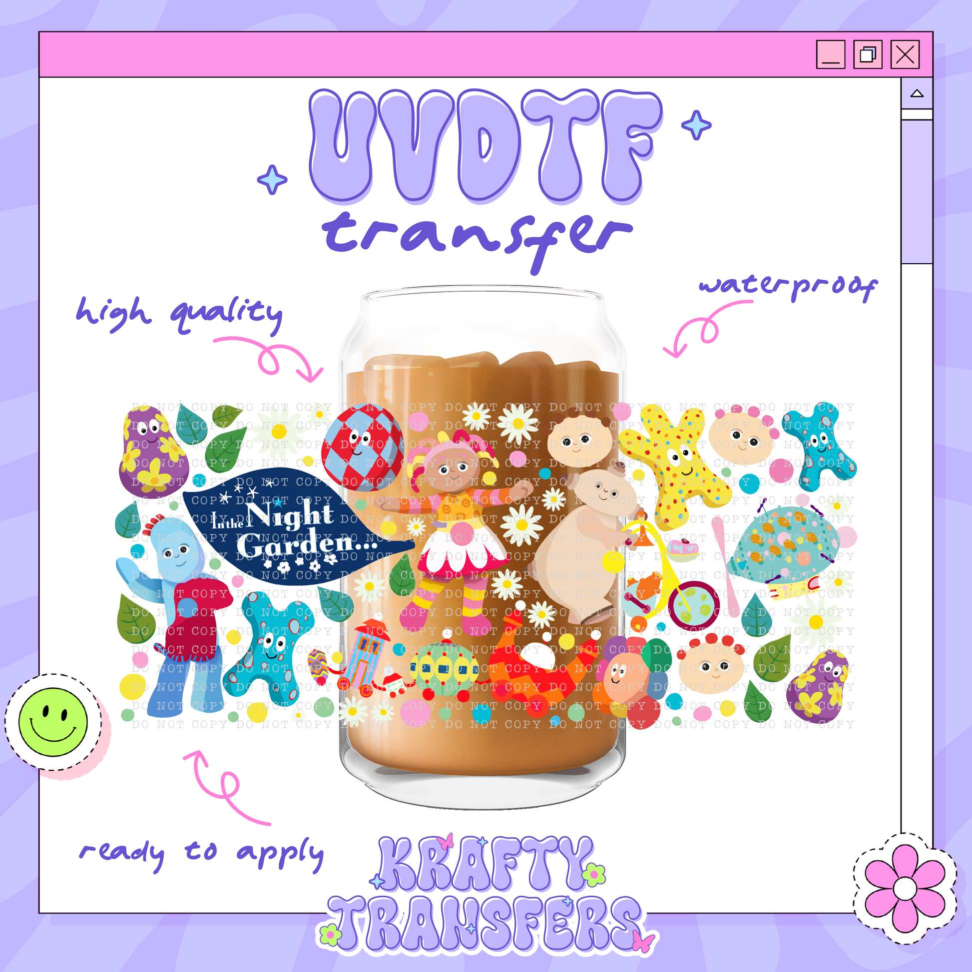 UV DTF wrap designed for 16 oz Libbey Glass Cups, but may also be applied to plastic cups of varying sizes; simply measure and trim off any excess material.